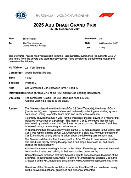 Yuki Tsunoda erhielt von den Rennkommissaren eine Verwarnung für seinen Zwischenfall mit Lando Norris im FP3, während Red Bull Racing eine Geldstrafe erhielt. Die beiden Fahrer hatten etwa 25 Minuten nach Beginn des letzten Freien Trainings der Saison auf dem
