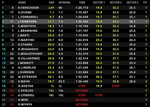In der letzten Runde war er auch in einen Vorfall mit Oliver Goethe verwickelt, der dazu führte, dass letzterer in Kurve 3 quer über die Strecke flog. Der Deutsche sagte über das Teamradio, dass Lindblad zu spät ausgewichen ist.