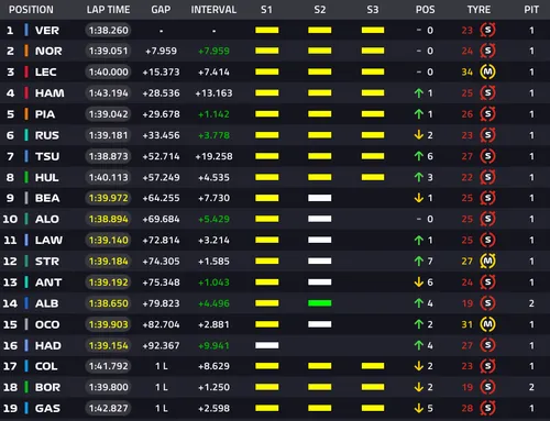 Yuki Tsunoda belegten die Plätze 6 und 7, mit Nico Hulkenberg, Ollie Bearman und Fernando Alonso vervollständigten die Top Ten.