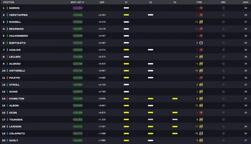 George Russell komplettierte die Top Drei, während Piastri die Top Ten verpasste. Russell wurde Dritter, nur +0,016 Sekunden langsamer als Verstappen.