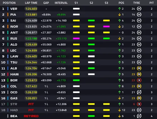 Nach einer Safety-Car-Phase, ausgelöst durch eine Kollision zwischen Nico Hülkenberg und Pierre Gasly, kamen alle bis auf Piastri, Norris und Esteban Ocon an die Box, um einen ihrer zwei obligatorischen Stopps zu absolvieren.