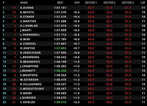 Für den Holländer war es ein Tag zum Vergessen, da er nur auf P11 landete. Aktuell Zweiter in der Meisterschaft, der Amerikaner Jak Crawford, stellte nur die 14. schnellste Zeit auf.