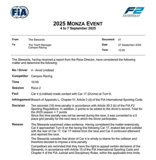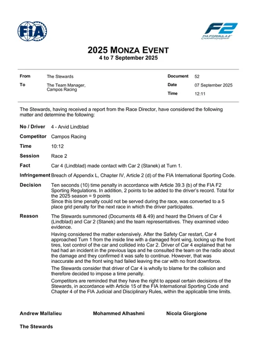Beide Vorfälle wurden von den Stewards als Lindblads Fehler beurteilt, was zu zwei Zehn-Sekunden-Zeitstrafen und vier Strafpunkten auf seinem Konto führte.