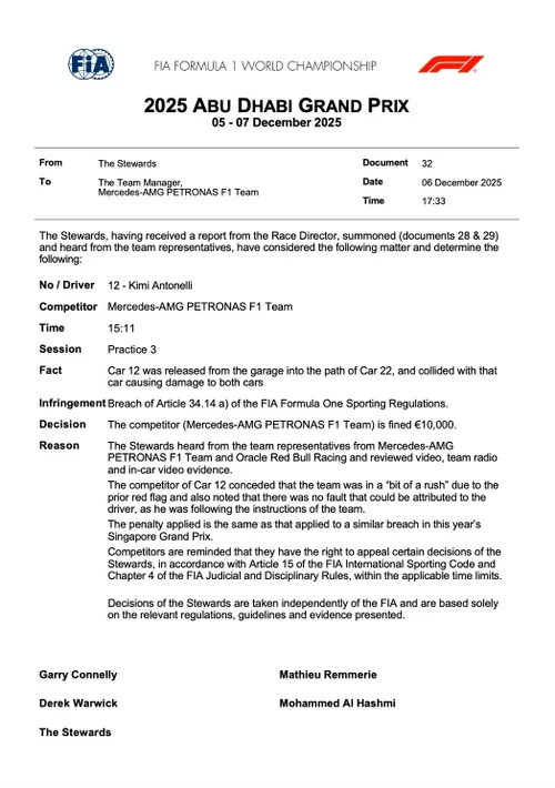 Mercedes erhielt nach dem Vorfall in der Boxengasse mit Kimi Antonelli und Yuki Tsunoda eine saftige Geldstrafe. Die beiden Fahrer kollidierten während des FP3 in der Boxengasse. Als Antonelli seine Garage verließ, befand sich der Red-Bull-Racing-Pilot bereits in der Fastlane, und der Rookie konnte einen Kontakt nicht vermeiden.