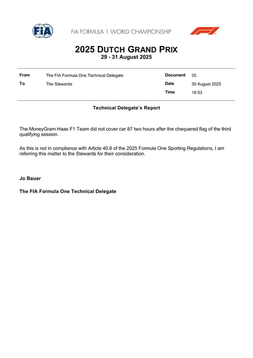 Die Stewards haben Stunden nach Abschluss des Qualifyings für den Großen Preis der Niederlande eine Untersuchung wegen Oliver Bearman und Haas vor sich. Das amerikanische Team hat sich nicht an die Parc fermé-Regeln gehalten, lautet das Dokument der FIA, was möglicherweise zu einer Strafe für den britischen Fahrer führen könnte.